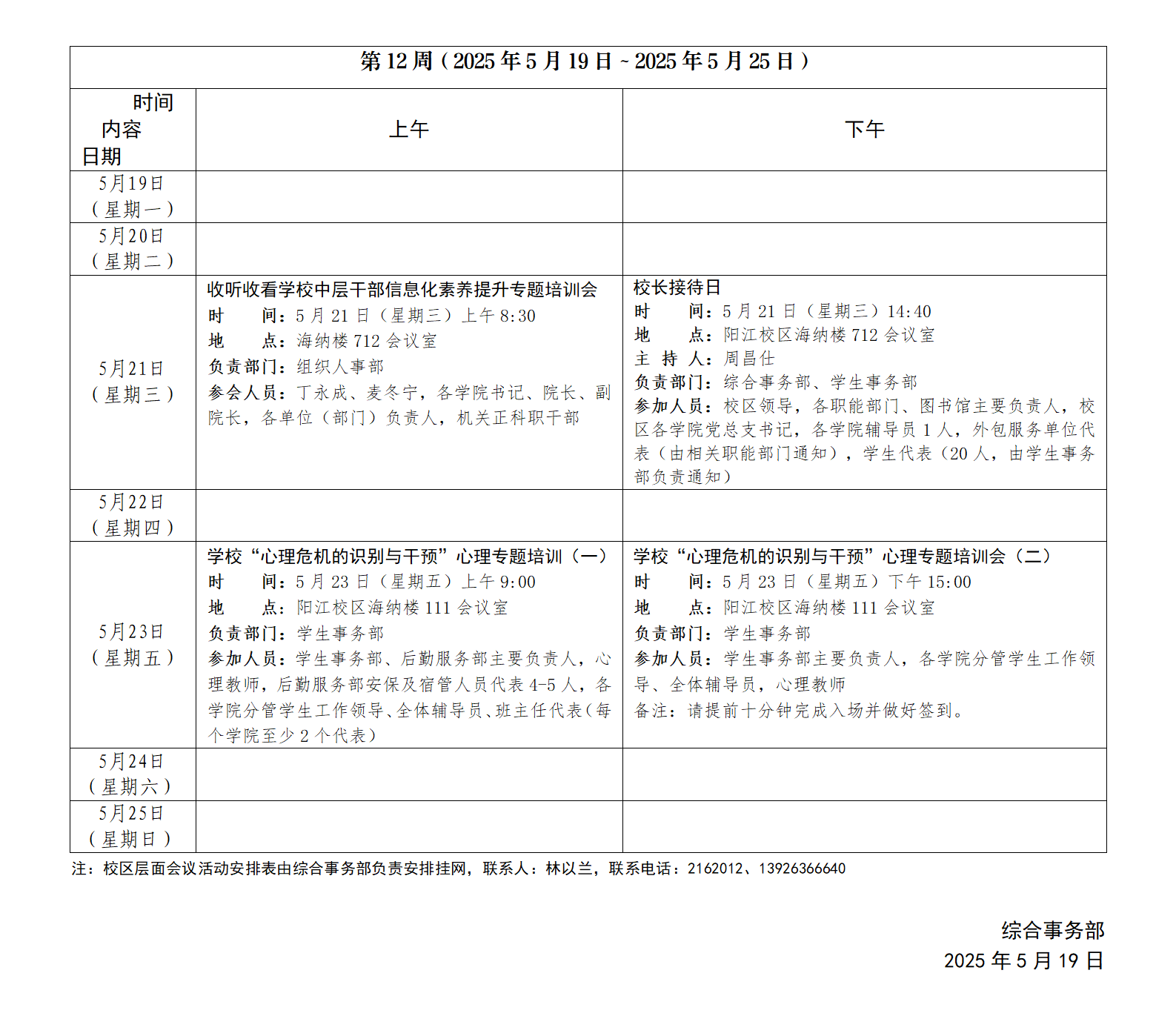 2024~2025学年第二学期第12周会议活动安排表