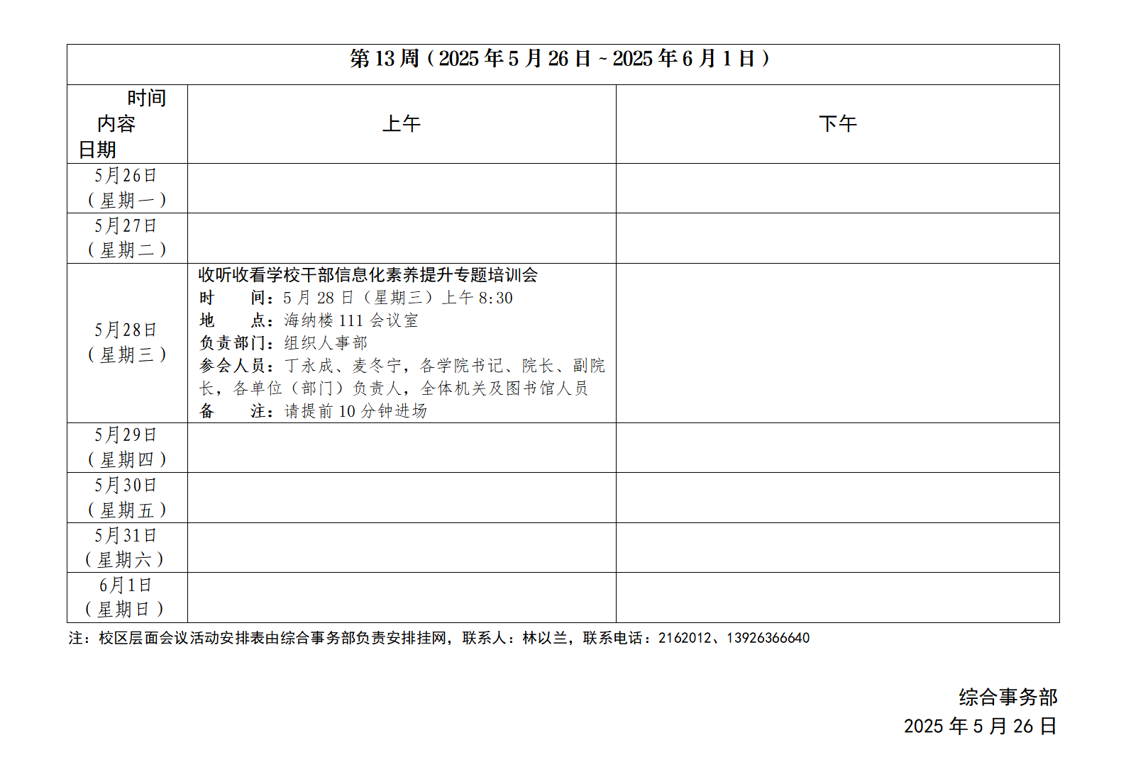 2024~2025学年第二学期第13周会议活动安排表