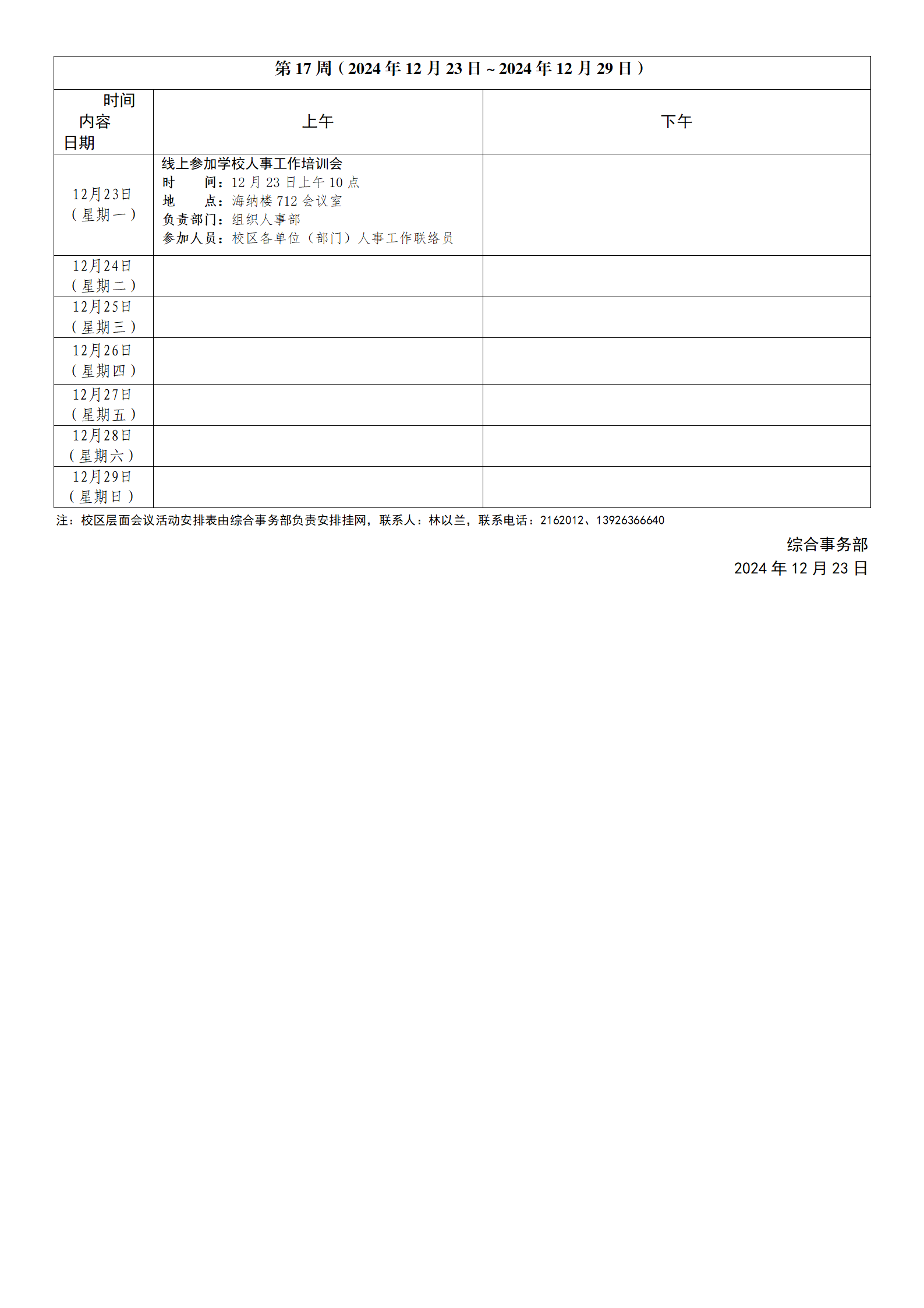 2024~2025学年第一学期第16周会议活动安排表