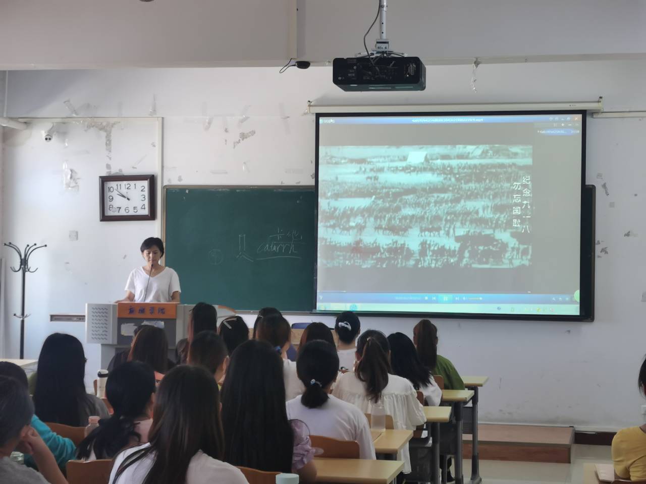 宣讲由授课老师杨凤鸣、穆荣红、邢滇霞老师组织,2019级护理、助产专业学生以班级为单位全部参与。授课老师首先以视频、PPT讲解方式向同学们展示了89年前“9·18”爆发后国人受屈辱的历史,宣讲“勿忘国耻 砥砺前行”的精神。观看影片的过程中,一幕幕屠杀中国军民的场面,烧、杀、抢、掠,大片河山被占领,日本军队一副副丑恶、凶残的嘴脸,激起了同学们对侵华日军的极度愤慨。随着10点整防空警报鸣响,全体起立,默诵国歌,行注目礼,全体默哀一分钟,让这段深刻的历史永远铭记在师生的脑海里。