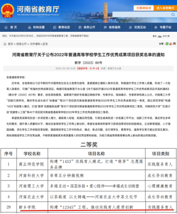2023年3月28日,河南省教育厅下发《河南省教育厅关于公布2022年普通高等学校学生工作优秀成果项目获奖名单的通知》(教学〔2023〕86号),beat365英国官方网站参评的“构建‘12345’工程推动实践育人提质创新”项目荣获2022年普通高等学校学生工作优秀成果二等奖。
