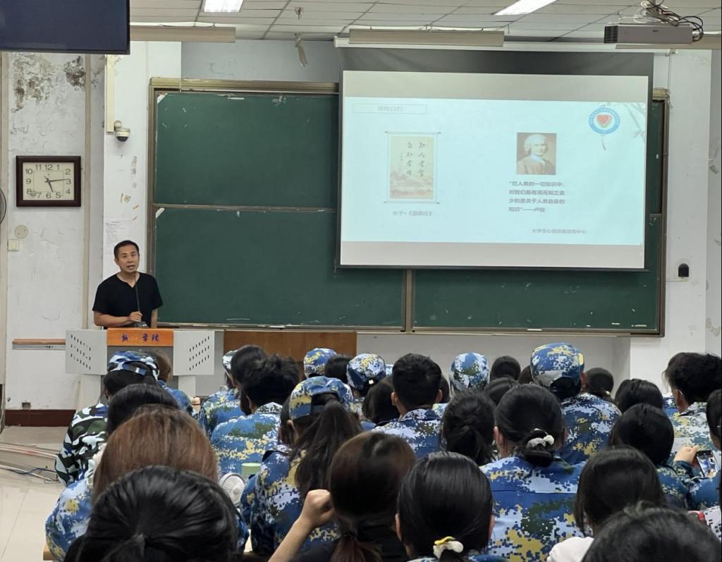 本次心理健康教育是面向新生开展的一次具有专业性、针对性的教育。首先,徐辉向同学们介绍了心理健康教育开设的内容及其意义,并引用了《道德经》中的一句“知人者智,自知者明”,从辩证思维的角度向同学们讲解了如何及时发现、辨别、处理同学们在心理的不健康状况。紧接着,徐辉列举了当代大学生可能出现的心理问题,通过生动的事例引导学生们积极的面对挫折,保持心理健康。最后,徐辉为学生们介绍了心理自助的方式方法,以及免费进行心理健康咨询的通道。