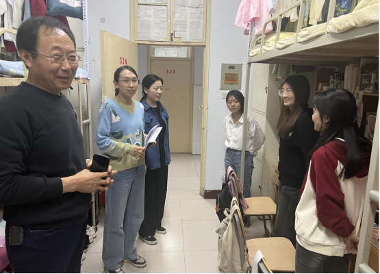 走访过程中,张翊与E01-210宿舍学生展开亲切的交谈,鼓励同学们在以后的学习、工作中积极进取,不断提升综合素质,实现自我价值。张继新与E08-128宿舍学生交谈中,针对同学们升学、实习和就业方面的困惑给予了诚恳的建议和意见。王恃走进东区餐厅了解同学们的饮食状况,并与餐厅兼职学生交谈,了解其生活、学习状况,鼓励同学们珍惜韶华,不负青春。