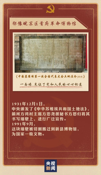 这不是一块普通的砖墙,它上面书写着《中国苏维埃第一次全国代表大会土地法令(草案)》。正是这块“墙”,说出了当时农民对于土地问题的心声,给他们带来了巨大的希望,它见证着党和人民的心心相连。方湾村燃起的“星星之火”,逐渐蔓延到全国的各个角落。