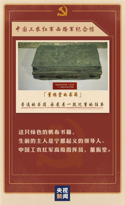 书箱的主人叫董振堂。他曾任国民党旅长,在认清了“国民党欺骗、压迫、剥削的本质”后,义无反顾地加入了红军的队伍。加入共产党那天,他把自己积攒下来的3000多块银圆,全部作为党费上交给了党。毛主席劝他留些钱自用,他却说:“我要把一切献给党,甚至连生命也献给党!”他如是说,也如是做。