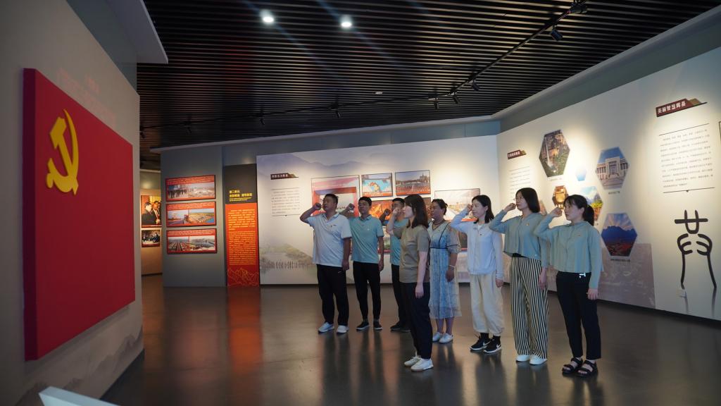 “我志愿加入中国共产党,拥护党的纲领,遵守党的章程,履行党员义务……”党员同志们在“辉县人民干得好展览馆”前重温入党誓词,面向鲜红的中国共产党党旗,大家郑重肃立,举起右拳庄严宣誓,铿锵有力地表达了为党的事业奋斗终身的坚定信念。在参观展览馆时,大家仔细聆听了讲解员对“水旱频繁、共城大地民生艰”、“艰苦奋斗、辉县山河重安排”、“不忘初心、砥砺奋进铸辉煌”三个主题展厅的介绍,共同追溯了郑永和等英雄模范及石姑娘队、愚公移山专业队等先进群体的英勇事迹,馆内的每一张图片都生动再现了上世纪六七十年代辉县人民战天斗地、大干苦干实干的场景。大家充分感受到辉县人民“一不怕累、二不怕死”的“辉县精神”,为劳动模范们坚定理想信念和以民族复兴为己任的主人翁精神深深感动。